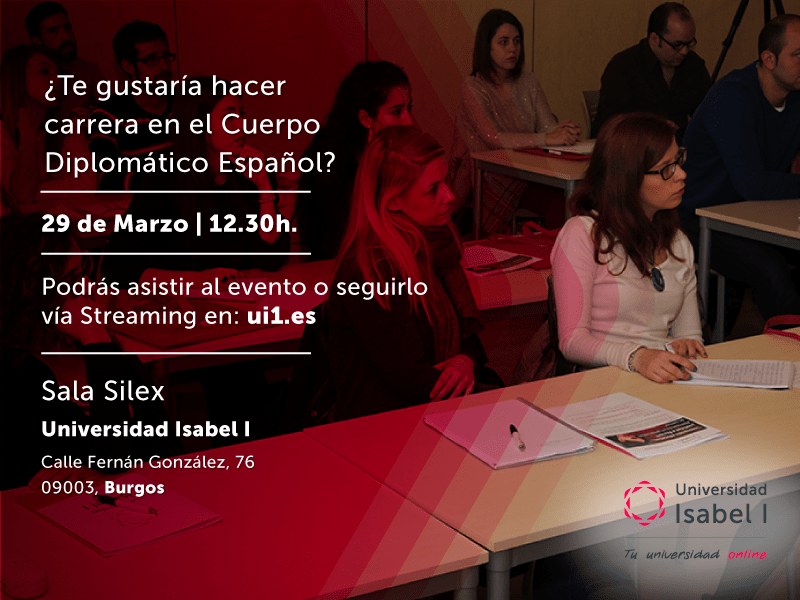23 de marzo de 2017. El próximo miércoles, 29 de marzo, a las 12.30 horas, tendrá lugar en la sede de la Universidad Isabel I en Burgos una charla dirigida a estudiantes universitarios en la que se informará sobre las posibilidades de acceso y oportunidades laborales asociadas al Cuerpo Diplomático Español.