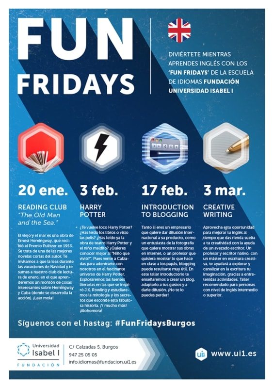Todas las actividades de los ‘Fun Fridays’ son de carácter gratuito y abiertas a cualquier persona interesada. Las actividades tendrán lugar a partir de las 18 horas en la sede de la Escuela de Idiomas de la Fundación Universidad Isabel I, situada en la Calle Calzadas, número 5, en Burgos.