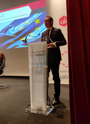 Jorge Antonio Jiménez Carrero analizó diversos reglamentos de la UE en materia de protección internacional, asilo y migración, destacando especialmente el nuevo reglamento de triaje, que considera un avance clave: “clasifica para dirimir a qué procedimiento se debe llevar a protección internacional y el asilo o al de retorno a su país de origen”. También abordó la solidaridad flexible entre Estados miembros y las condiciones mínimas para solicitantes de asilo, pero centró su intervención en propuestas futuras que refuercen el enfoque humanitario. Entre ellas, subrayó la necesidad de implantar un visado humanitario, aplicar el derecho marítimo internacional en los rescates, y que la Agencia de Asilo asuma la resolución de solicitudes, además de fomentar el patrocinio privado para integrar a los refugiados en Europa, reforzando así una política migratoria más eficaz y respetuosa con los derechos humanos.