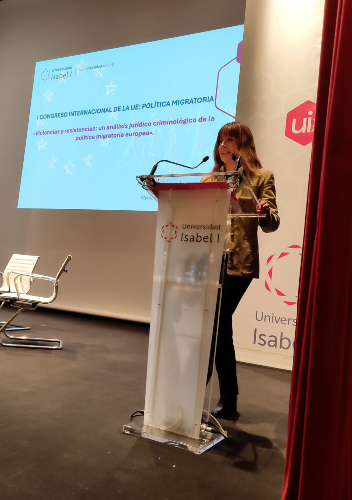 La primera jornada se dividió en dos bloques temáticos. El Bloque 1, moderado por Reinaldo Batista, comenzó con una conferencia inaugural a cargo de Myriam Rodríguez Lorenzo, docente del Grado en Criminología de la Universidad Isabel I. La docente analizó la política migratoria europea desde un enfoque securitario, destacando la necesidad de centrarse en el migrante como “sujeto de derechos humanos”. La ponente definió las rutas migratorias atlánticas y mediterráneas como “las más mortíferas del mundo”, citando datos de la ONG Caminando Fronteras: en 2024, se registraron 10.457 personas fallecidas a los que se suman 137 embarcaciones desaparecidas. Por su parte, la Comisión Europea y el Frontex, indican un número de 12.282 llegadas irregulares a España en 2025. La docente recalcó que muchas veces se gestiona la migración (suscrita al Derecho administrativo) “como si fuera un delito” (con el Derecho penal), y que es esencial pensar en alternativas desde la criminología que defiendan los derechos humanos y cuestionen las actuales relaciones de poder.