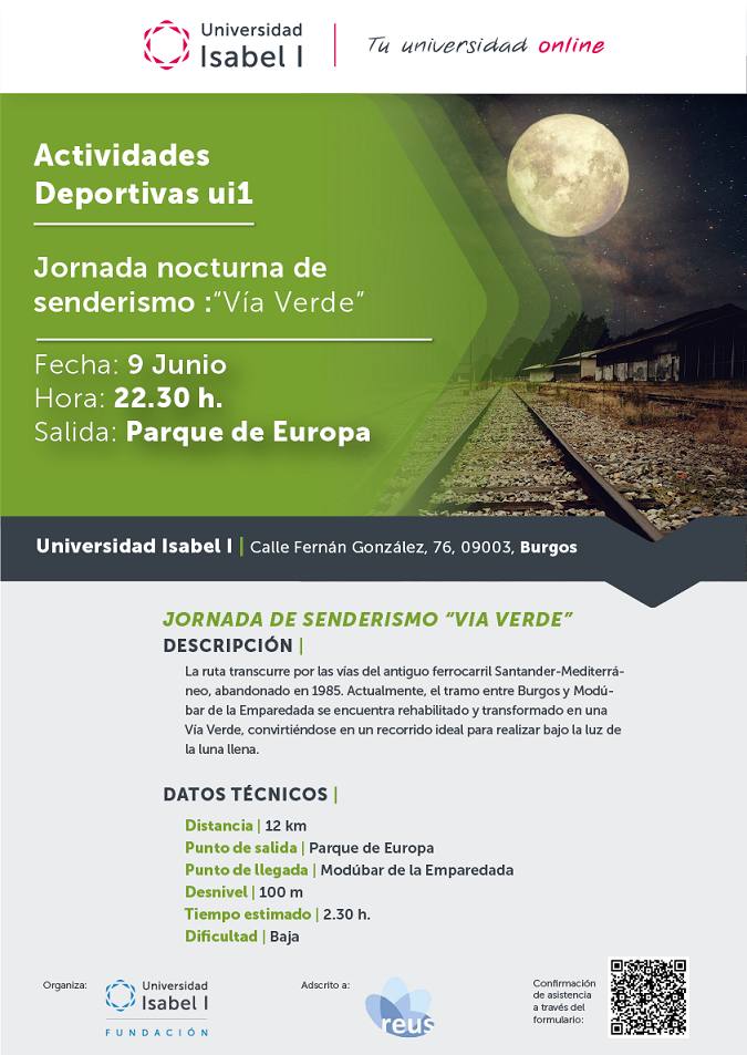 La Universidad Isabel I organizó el pasado viernes, 9 de junio, una actividad deportiva adscrita a la Red Española de Universidades Saludables (REUS), para recorrer la ruta de la Vía Verde por la noche. El itinerario transcurrió por las vías del antiguo ferrocarril Santander-Mediterráneo, abandonado en 1985, entre Burgos y Módubar de la Emparedada. La rehabilitación que se ha llevado a cabo en este espacio lo convierte en un tramo ideal para caminar bajo la luz de la luna llena. Ocho trabajadores de la Universidad y sus acompañantes completaron los 12 kilómetros del recorrido equipados con sus linternas en una noche diferente y especial.