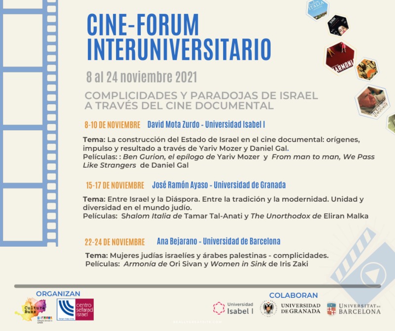 No obstante, el día 3 de noviembre a las 18:00 horas será la presentación oficial de esta actividad, presidida por Rodica Radian Gordon, la primera embajadora de Israel en España; Miguel de Lucas, director del Centro Sefarad-Israel y Jesús Arcos, antiguo alumno de la Universidad y asesor de proyectos del agregado cultural en esta embajada. Posteriormente, los docentes de las distintas universidades participantes harán una breve presentación de lo que trabajarán en las películas elegidas.