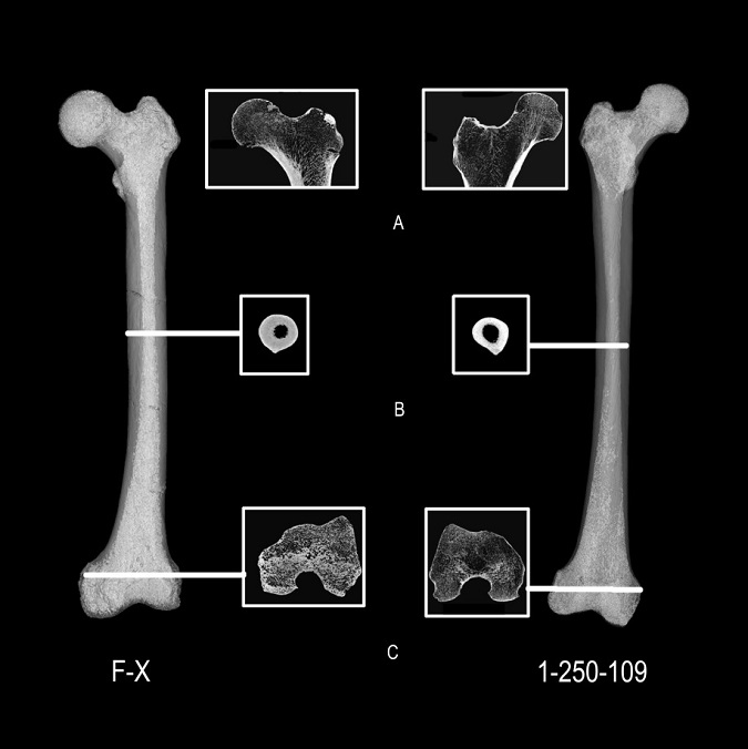Figura 1: Comparación del femur entre un humano de la Sima de los Huesos y un humano moderno del mismo tamaño (@LRG).