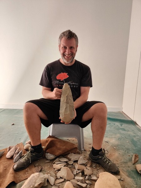 Imagen de Marcos Terradillos produciendo un bifaz.