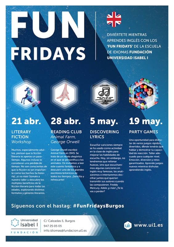14 de abril de 2017. Este viernes, 21 de abril, se pone en marcha la tercera edición de los "Fun Fridays", una serie de actividades, gratuitas y de entrada libre, organizadas por la Escuela de Idiomas Fundación Universidad Isabel I. Con esta iniciativa se pretende pasar un rato distendido a la vez que se mejoran las competencias en habla inglesa.