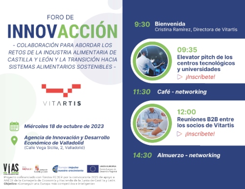 17 de octubre de 2023. El lema de este año para el Foro de Innovación persigue la colaboración para abordar los retos de la industria alimentaria de Castilla y León y la transición hacia sistemas alimentarios sostenibles. Foro de Innovación se desarrollará en dos partes: un pitch de socios tecnológicos y un encuentro de reuniones B2B entre socios de Vitartis.