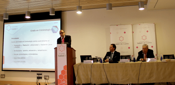 Aitor Curiel López de Arcaute, decano de la Facultad, ha destacado que la titulación de Criminología en la Isabel I «es impartida por criminólogos en ejercicio, profesionales que, por tanto, conocen el verdadero pulso de esta profesión». Curiel ha puesto de relieve que el papel fundamental de los criminólogos es contribuir eficazmente a mejorar la seguridad del país: «La criminología es una ciencia reglada desde hace poco tiempo en España, pero que sin embargo tiene demanda y salidas profesionales. El papel activo de estos profesionales en la prevención de delitos, mediación y rehabilitación es un factor que indica el grado de desarrollo de una nación, y el nivel de los conocimientos y especialización de las Fuerzas y Cuerpos de Seguridad de España está a la altura de los países más avanzados en la materia, como Estados Unidos, Inglaterra y Australia».