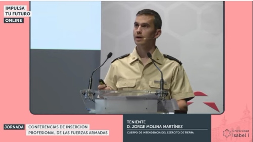 Por último, Jorge Molina Martínez, teniente del Cuerpo de Intendencia del Ejército de Tierra, destacó su experiencia personal en el proceso de acceso a la oposición y su trayectoria profesional, tras obtener el título de licenciado en ADE en 2015, año en el que cambió el reglamento y el número de cursos de formación una vez aprobadas las oposiciones pasó de 1 a 2 años. El teniente Molina destacó que entre sus actividades están “las funciones logísticas de apoyo a las unidades que realizan maniobras, el apoyo permanente de los centros de abastecimiento, carburantes o municiones”. Otras funciones son el apoyo en raciones de campaña, transportes y otras actividades como el asesoramiento en materia económico-financiero, de formulación de propuestas de gasto, de gestión y control de tesorería.