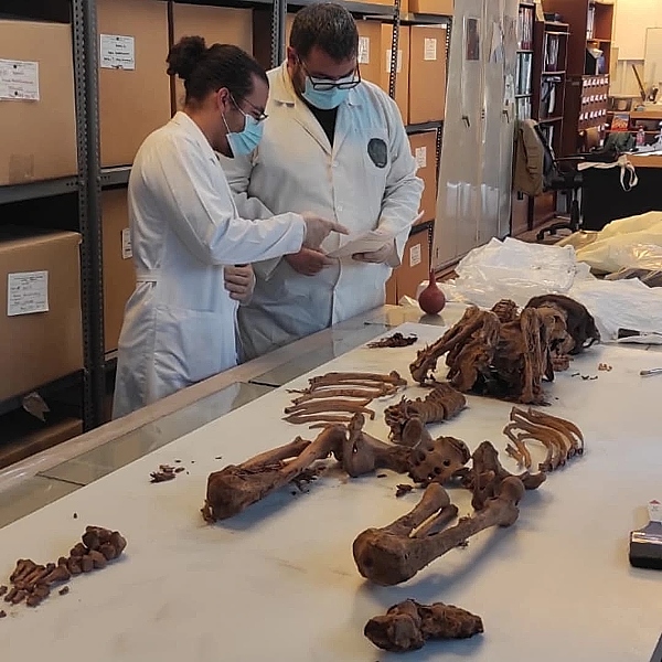 Ricardo Ortega Ruiz analizando con otro investigador unos restos humanos en el laboratorio.