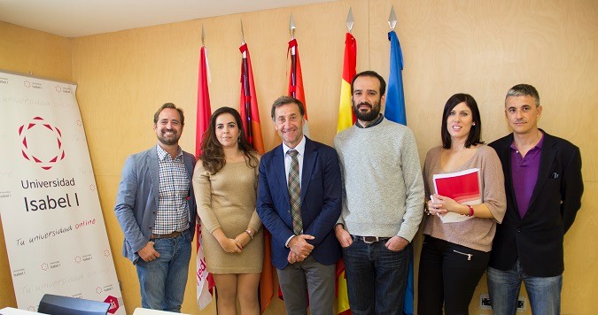 De izquierda a derecha: Alberto Campo, responsable del Área de Corporaciones de la Universidad Isabel I, Sara Barriuso, presidenta de AJE, Alberto Gómez Barahona, rector de la institución académica, Alberto Olalla, vocal de AJE, Cristina Pérez Espés, directora del Grado en ADE, y Benito Pérez González, profesor del Grado en ADE.