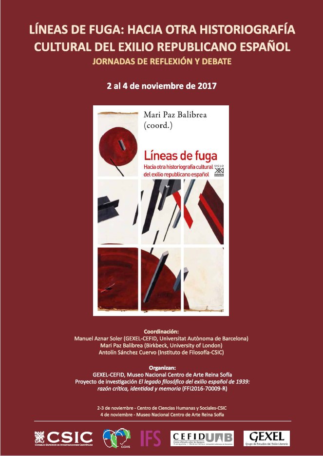 El objetivo de estas jornadas es reunir a investigadores del exilio republicano de diversas instituciones educativas del mundo, interesados en plantear nuevas perspectivas para su análisis. El evento se enmarca dentro de la publicación del libro ‘Líneas de Fuga: Hacia otra historiografía del exilio español’, al que Andrea Luquín contribuye con un capítulo. Partiendo de esta base, reúne a profesores universitarios y de instituciones procedentes de Inglaterra, Escocia, Irlanda, Estados Unidos y Canadá, así como del Centro Superior de Investigaciones Científicas (CSIC) y de las universidades de Valencia, Extremadura, Deusto, Alcalá de Henares, Complutense de Madrid, Barcelona y la Uned.