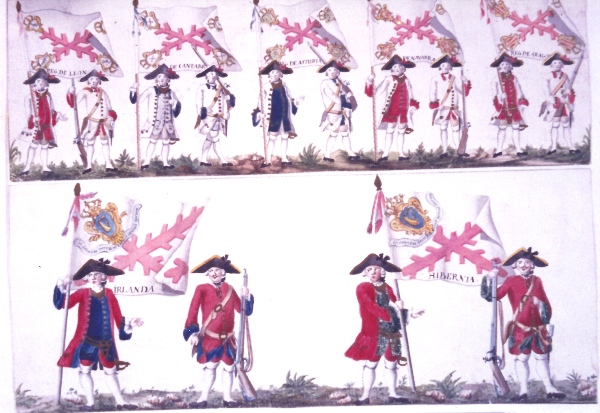 Los borbones mantuvieron las aspas con fondo blanco, siendo cara regimiento portador de dos banderas: la llamada coronela (con el escudo y nada más, no distinguiéndose unas de otras) y la reglamentaria, con escudos en las esquinas, incorporadas en la época de Fernando VI. Estas banderas exhibían no solo las aspas, sino el escudo del regimiento y el nombre de la compañía.